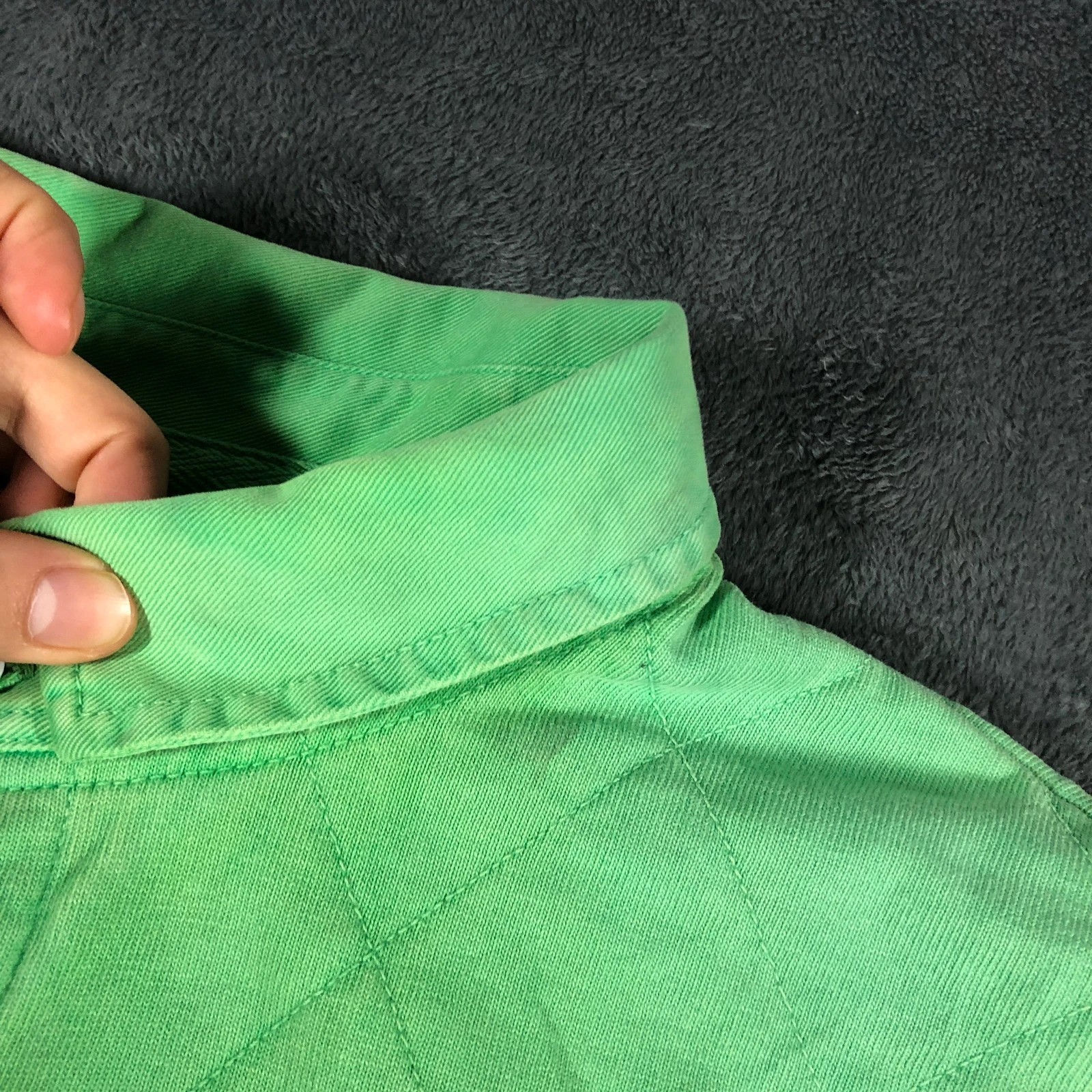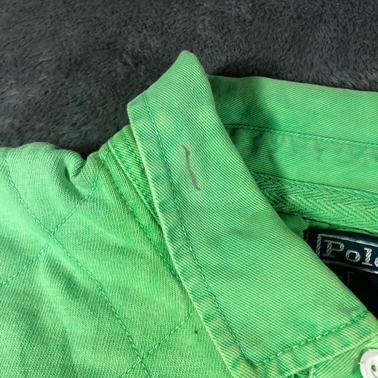 Condition: 4/10 – big discolouration stain on the front, fading on collar and some small black marks – can be reworked